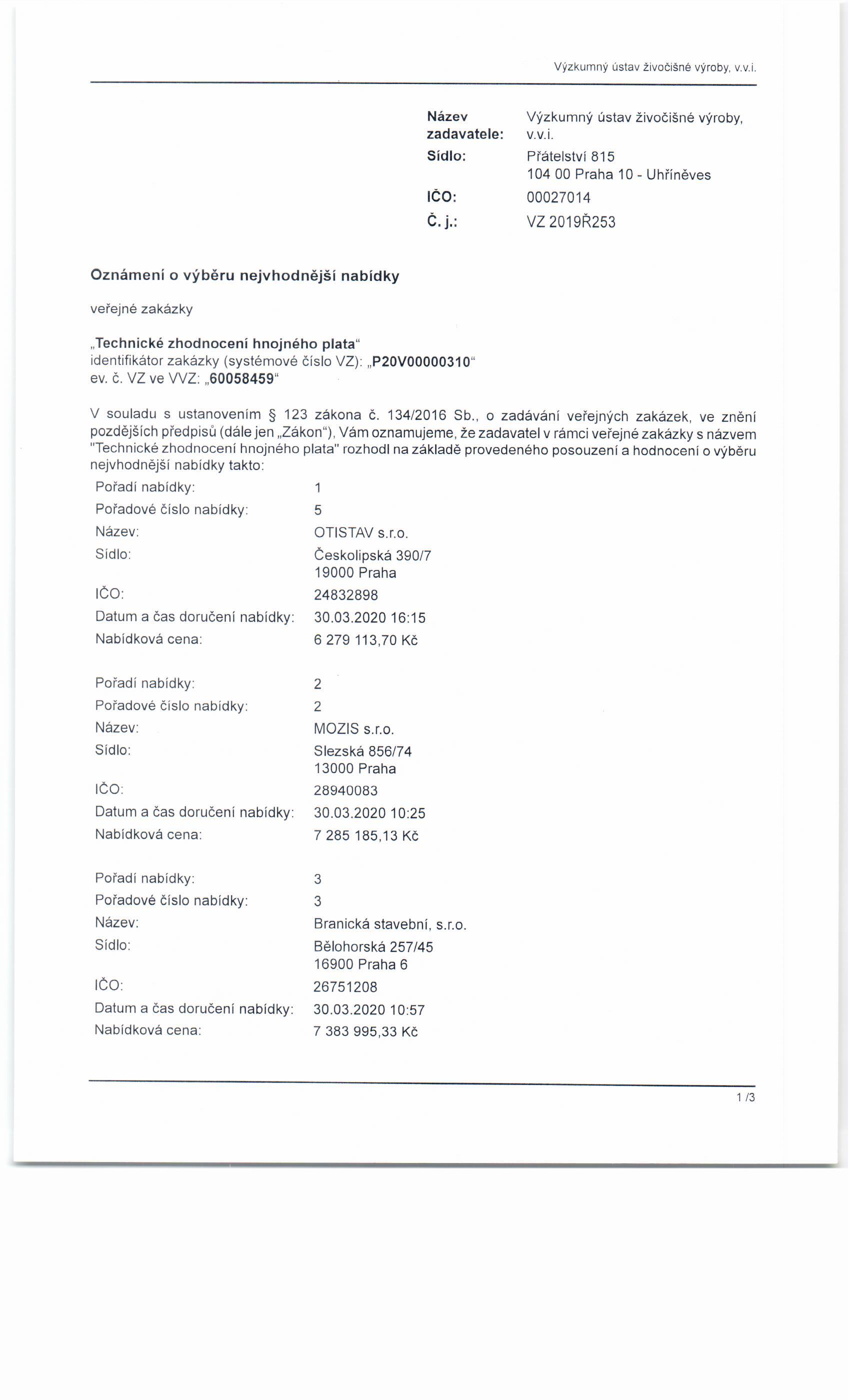 Systémové číslo: P20V00000310 Evidenční číslo zadavatele: VZ 2019Ř253 Dle zákona: č. 134/2016 Sb.